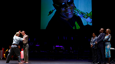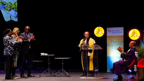 Le titre de Docteur Honoris Causa a été remis à Manu Dibango à titre posthume en présence de ses proches et un hommage chorégraphique et musical lui a été rendu à cette occasion par deux danseurs associés à l'Espace Pasolini.