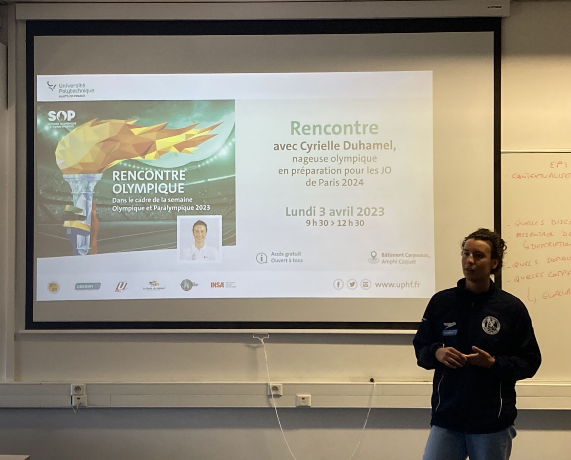Su visita a nuestras instalaciones dio lugar, en primer lugar, a una inspiradora audiencia de hora y media durante la cual cerca de 250 alumnos del STAPS (especializados en natación y/o deportistas de alto nivel de la universidad) pudieron conocer más de cerca la trayectoria de esta deportista profesional y hacerle algunas preguntas.