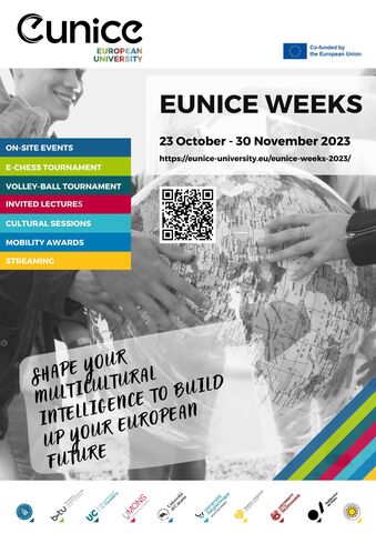 Organizadas por primera vez en 2021, las Semanas EUNICE tendrán lugar este año del 23 de octubre al 30 de noviembre. El objetivo de estas semanas es concienciar a los estudiantes, y a la comunidad universitaria en general, de su identidad europea mediante la promoción de los valores europeos de multilingüismo, interculturalidad e inclusión.