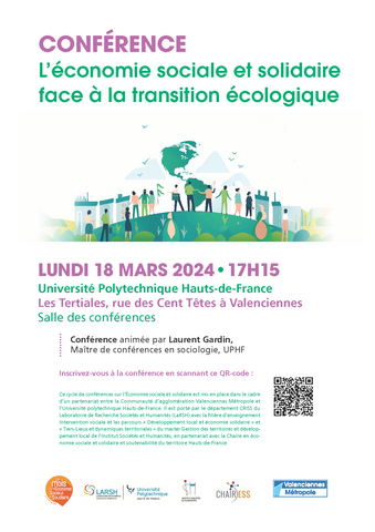 Ce cycle de conférences sur l’Économie sociale et solidaire est mis en place dans le cadre d’un partenariat entre la Communauté d’agglomération Valenciennes Métropole et l’Université polytechnique Hauts-de-France. Il est porté par le département CRISS du Laboratoire de Recherche Sociétés et Humanités (LARSH) avec la filière d’enseignement Intervention sociale et les parcours « Développement local et économie solidaire » et« Tiers-Lieux et dynamiques territoriales » du master Gestion des territoires et développement local de l’Institut Sociétés et Humanités, en partenariat avec la Chaire en économie sociale et solidaire et soutenabilité du territoire Hauts-de-France.