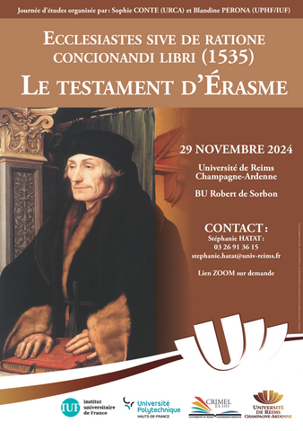 15 h 30 – 16 h 00 : Discussion de clôture pour préparer le livre Le Testament d’Érasme publié dans la collection Héritages critiques des Presses Universitaires de Reims (Épure).